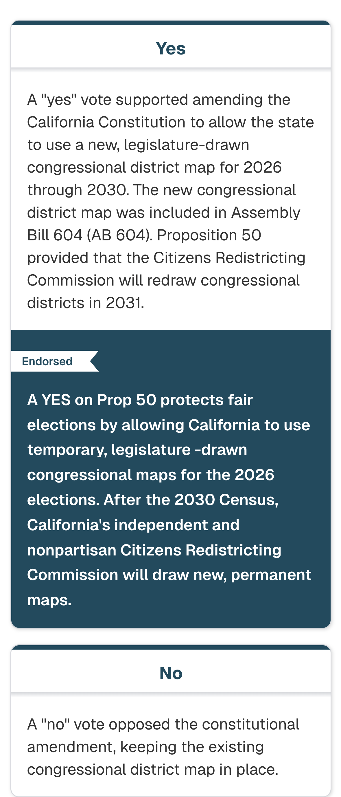 MCA endorsed Prop 50, California’s redistricting ballot measure, and added a brief description to provide additional context and explain its stance. Note: This endorsement represents the views of MCA, NOT TurboVote or Democracy Works.