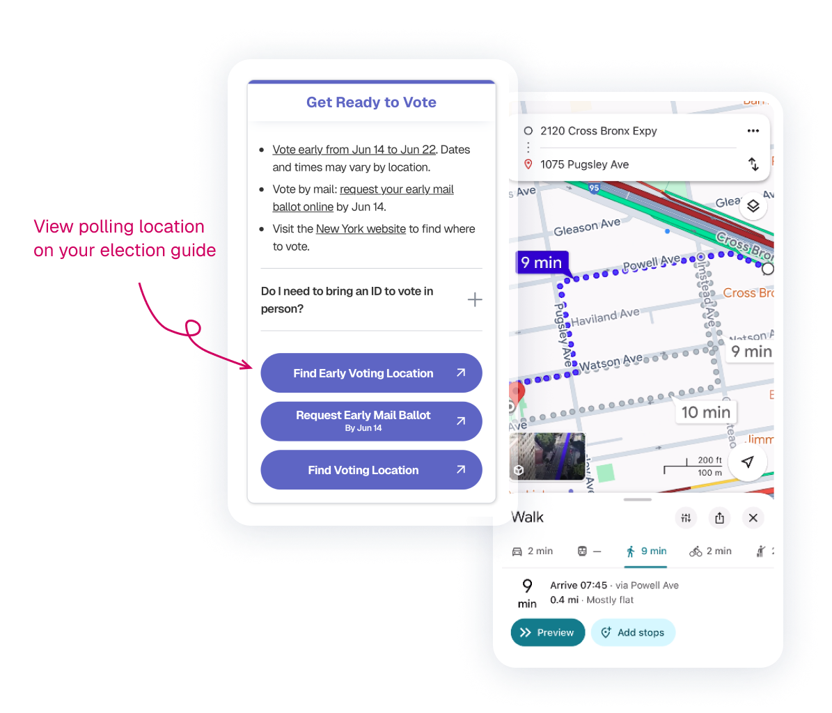 After early voting begins on June 16, voters will be able to tap to find their polling location and get directions, directly from their TurboVote election guide. It’s fast, simple, and eliminates uncertainty.
